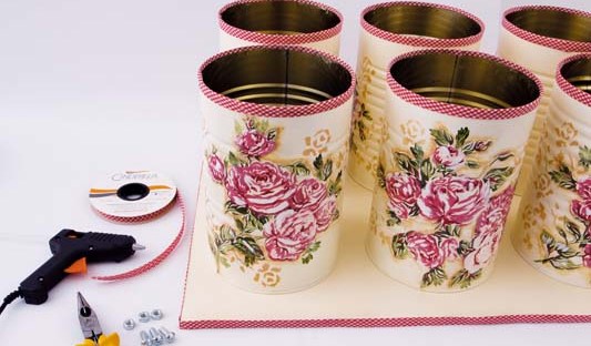 Pinte as latas das cores que preferir. Em seguida, cole o pedaço de tecido decorado e a fita na borda da lata, para fazer o acabamento.
